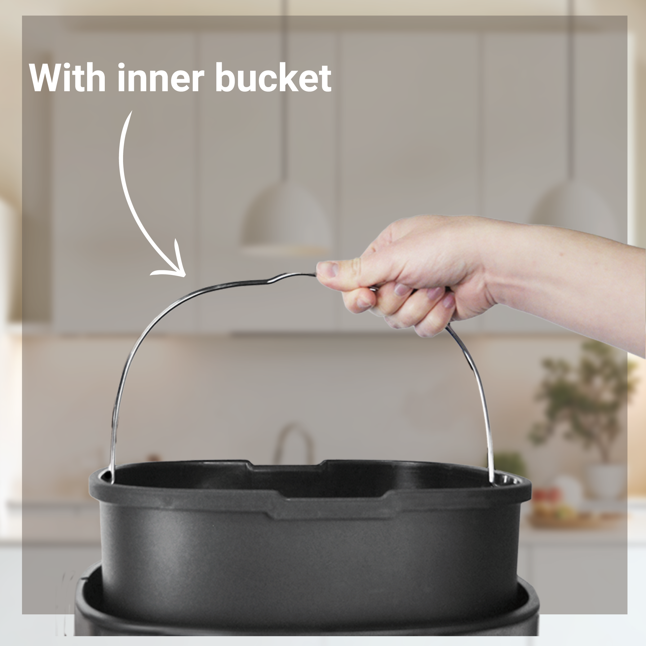 Gemaakt van hoogwaardig roestvrij staal 410 en uitgerust met een mute open/close system. De deksel veert langzaam terug zonder geluid.- ✓ Afvalzakbevestigingsring verbergt en houdt de afvalzak op zijn plaats.